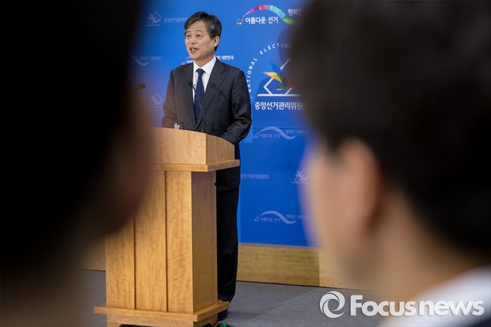 (과천=포커스뉴스) 이인복 중앙선거관리위원장이 제20대 국회의원선거를 하루 앞둔 12일 오전 경기도 과천시 중앙선거관리위원회에서 투표 참여를 독려하는 대국민 담화문을 발표하고 있다.