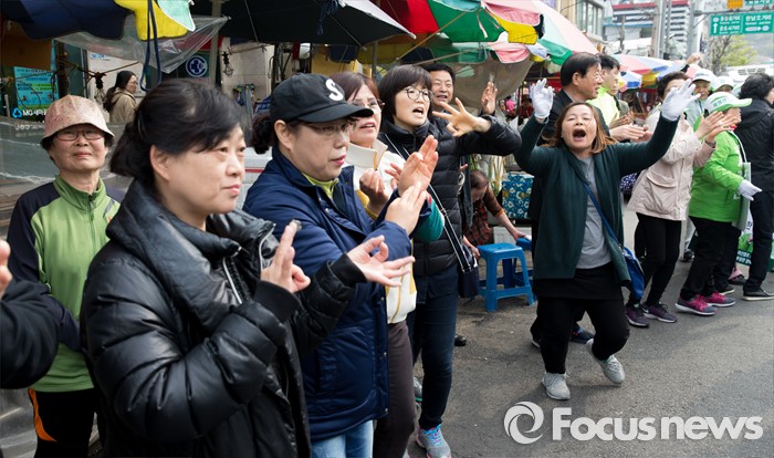 (서울=포커스뉴스) 12일 오전 서울 성동구 금장시장 앞에서 안철수 국민의당 상임공동대표와 서경선 중구성동구갑 후보, 정호준 중구성동구을 후보 지지자들이 환호하고 있다.