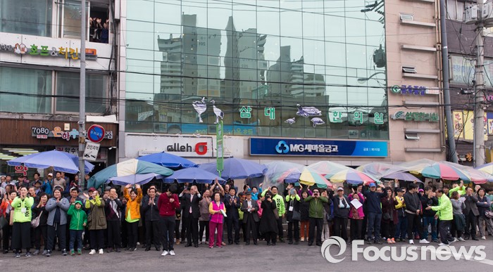 (서울=포커스뉴스) 12일 오전 서울 성동구 금장시장 앞에서 안철수 국민의당 상임공동대표와 서경선 중구성동구갑 후보, 정호준 중구성동구을 후보 지지자들이 환호하고 있다.