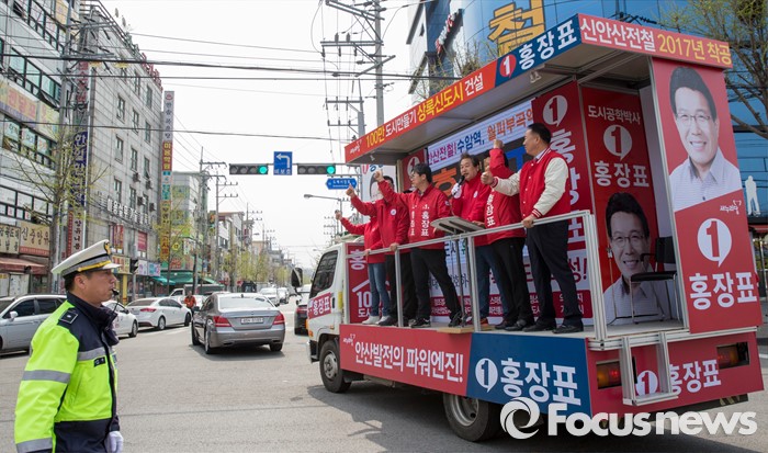 (안산=포커스뉴스) 4.13 총선을 하루 앞둔 12일 오전 경기 안산시 한대앞역 인근에서 홍장표 새누리당 안산시상록구을 후보 지원유세에 나선 김무성 대표가 유권자들의 지지를 호소하고 있다.