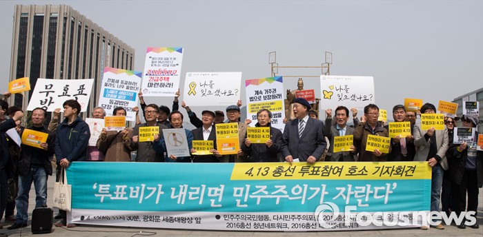 (서울=포커스뉴스) 제20대 국회의원 선거를 하루 앞둔 12일 오전 서울 광화문광장에서 2016 총선시민네트워크 회원들이 총선 투표참여를 호소하는 구호를 외치고 있다.