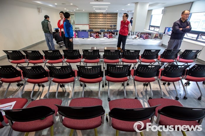 (서울=포커스뉴스) 제20대 국회의원선거를 하루 앞둔 12일 오전 서울 영등포구 새누리당사에서 관계자들이 선거상황실을 설치 하고 있다.