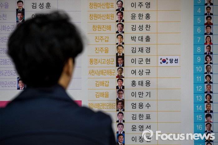 (서울=포커스뉴스) 제20대 국회의원선거를 하루 앞둔 12일 오전 서울 영등포구 새누리당사 선거상황실에 무투표로 당선이 확정된 이군현 새누리당 통영시고성군 후보 이름 옆에 '당선' 스티커가 붙어 있다.