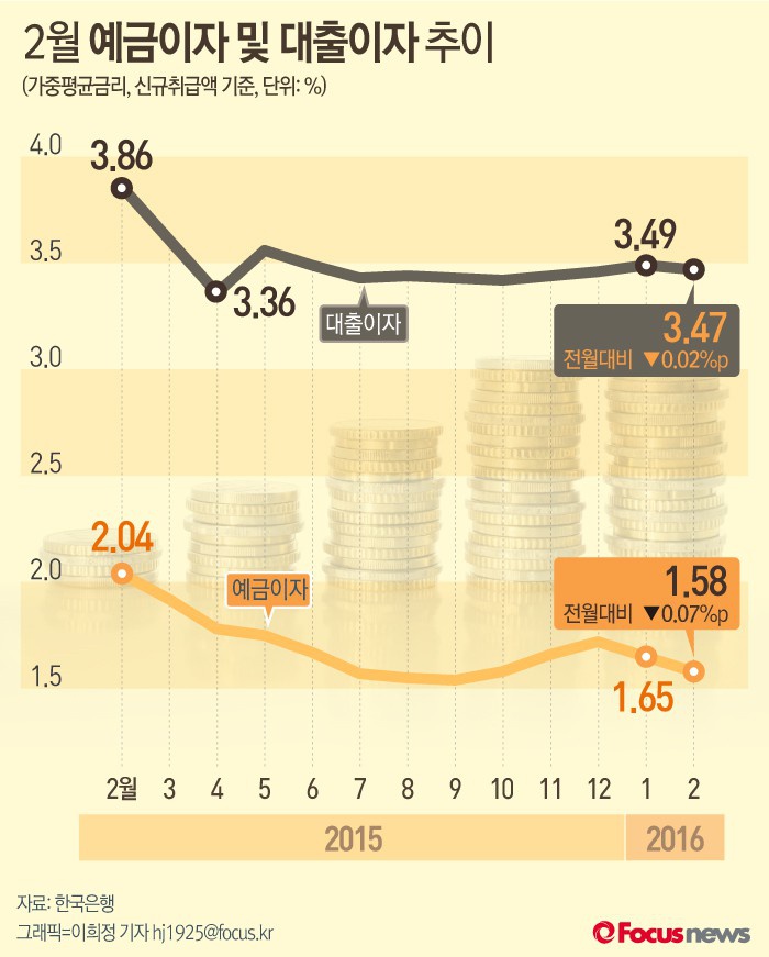 공제회의 한 관계자는 "그동안 급여율에 대한 국회나 감사원 지적이 있었고 높은 급여율을 맞추기 위해 상대적으로 고위험 투자처를 찾아야 했다"며 "안정적인 자산 운용을 위해서라도 급여율 인하는 불가피하다"고 말했다.(서울=포커스뉴스) 한국은행이 28일 낸 ‘2월 중 금융기관 가중평균금리’에 따르면 2월 대출금리는 3.47%였다. 예금은행의 신규취급액기준 저축성수신금리는 1.58%로 전월대비 0.07%포인트 떨어졌다. 2016.03.28 이희정 기자