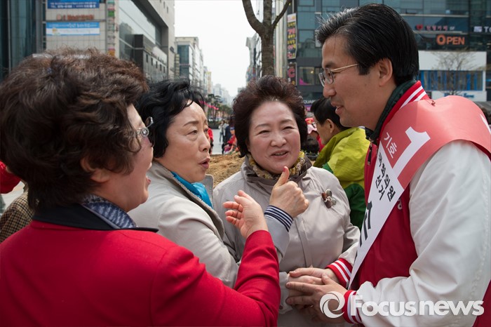 (고양=포커스뉴스) 제20대 국회의원 선거를 하루 앞둔 12일 오후 경기도 고양시 화정역 앞에서 손범규 새누리당 고양갑 후보가 지지자들과 대화하고 있다.