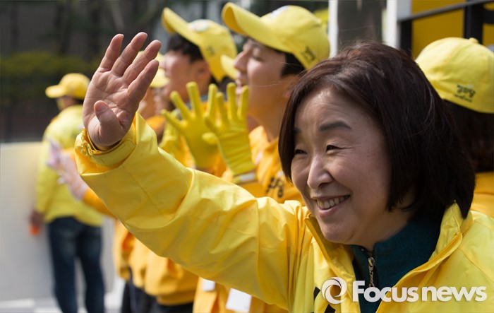 (고양=포커스뉴스) 제20대 국회의원 선거를 하루 앞둔 12일 오후 심상정 정의당 고양갑 후보가 경기 고양시 롯데마트 화정점 앞에서 유권자들에게 지지호소 하고 있다.