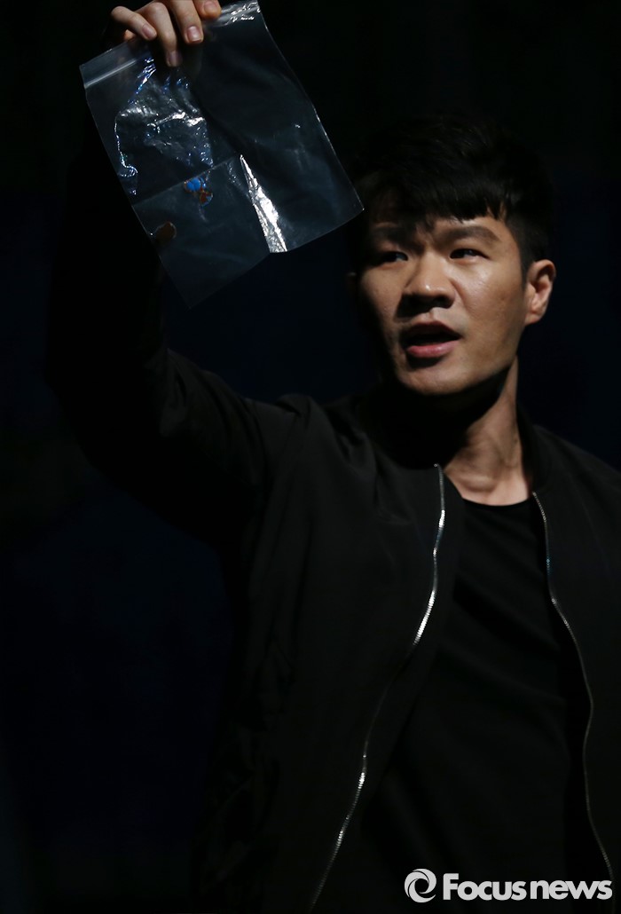(서울=포커스뉴스) 12일 오후 서울 종로구 아트원씨어터에서 열린 연극 '지구를 지켜라' 프레스콜에 참여한 배우 육현욱이 주요장면을 시연하고 있다.