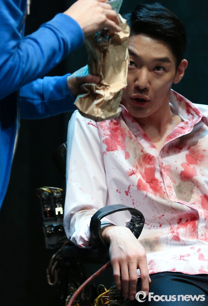 (서울=포커스뉴스) 12일 오후 서울 종로구 아트원씨어터에서 열린 연극 '지구를 지켜라' 프레스콜에 참여한 배우 김도빈이 주요장면을 시연하고 있다.