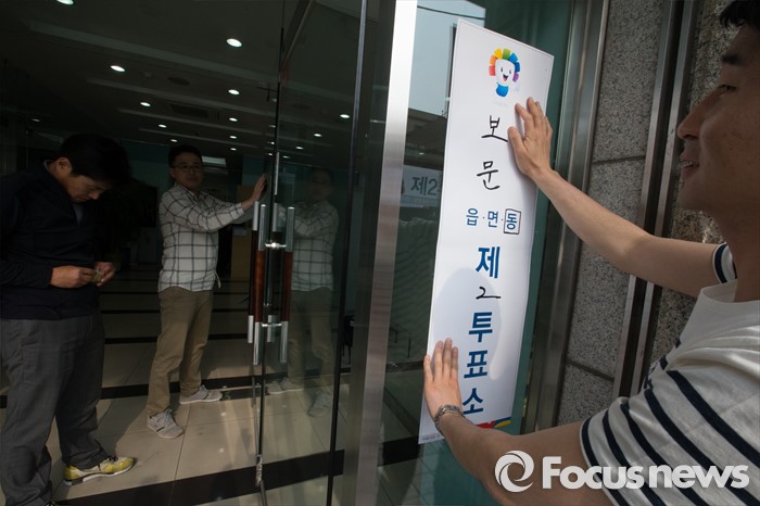 (서울=포커스뉴스) 4.13총선을 하루 앞둔 12일 오후 서울 성북구 보험연수원에 마련된 보문동 제2투표소에서 투표사무원들이 안내판을 설치하고 있다.