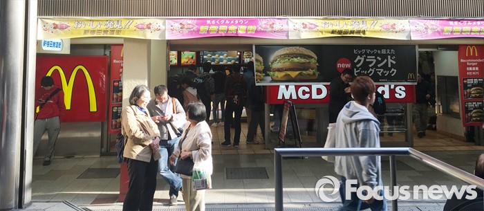 (서울=포커스뉴스) 일본 맥도날드가 광고에서 한국식 인사법을 선보여 논란이 되고 있으며 일본 국내에서는 불매운동 움직임까지 일어나고 있다. 사진은 12일 오후 일본 혼슈 오사카 우메다에 있는 맥도날드의 모습. <사진제공=독자>