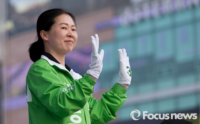 (광주=포커스뉴스) 4.13총선을 하루 앞둔 12일 오후 광주 광산구 타이어테크 수완점 앞에서 권은희 국민의당 광산구을 후보가 선거유세를 하고 있다.