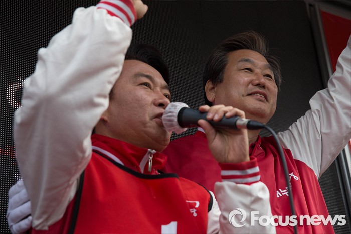 (서울=포커스뉴스) 20대 총선을 하루 앞둔 12일 오후 서울 마포구 신촌역 일대에서 김무성 새누리당 대표와 이성헌 서대문갑 후보가 선거유세를 하고 있다.