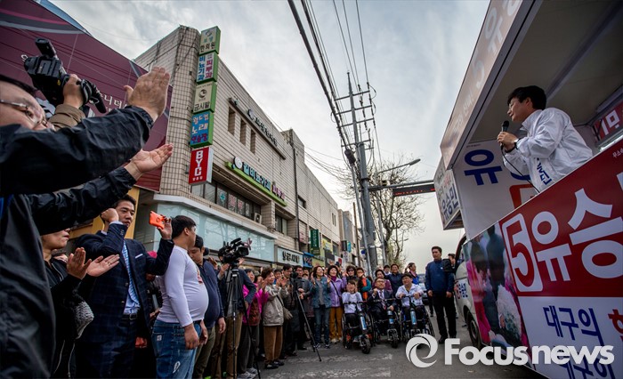 (대구=포커스뉴스) 유승민 무소속 대구 동구을 후보가 12일 오후 대구광역시 동구 방촌시장에서 유세를하며 유권자들에게 한 표를 호소 하고 있다.