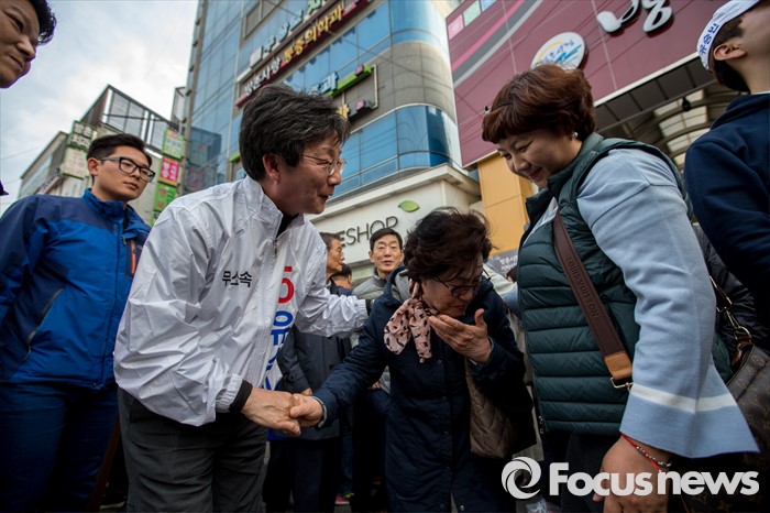 (대구=포커스뉴스) 유승민 무소속 대구 동구을 후보가 12일 오후 대구광역시 동구 방촌시장에서 유세를 마친 뒤 주민들과 악수하며 한 표를 호소 하고 있다.