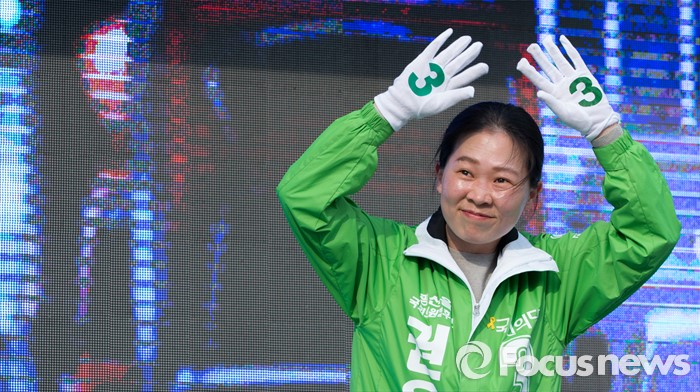 (광주=포커스뉴스) 4.13총선을 하루 앞둔 12일 오후 광주 광산구 타이어테크 수완점 앞에서 권은희 국민의당 광산구을 후보가 선거유세를 하고 있다.
