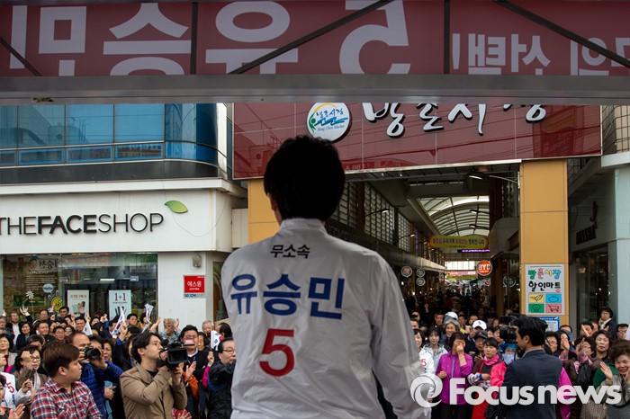 (대구=포커스뉴스) 유승민 무소속 대구 동구을 후보가 12일 오후 대구광역시 동구 방촌시장에서 유세를하며 유권자들에게 한 표를 호소 하고 있다.