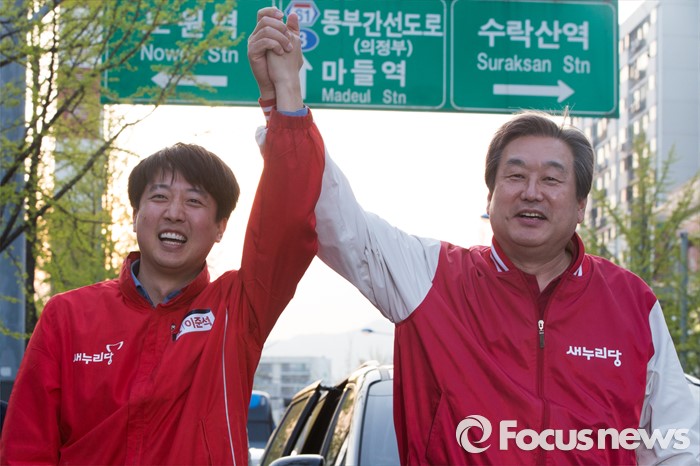 (서울=포커스뉴스) 12일 오후 서울 노원구 GS수퍼마켓 상계점 앞에서 김무성 새누리당 대표가 이준석 새누리당 노원병 후보자 지원 유세를 하고 있다.