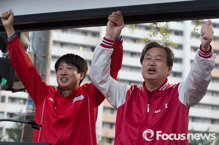 (서울=포커스뉴스) 12일 오후 서울 노원구 GS수퍼마켓 상계점 앞에서 김무성 새누리당 대표가 이준석 새누리당 노원병 후보자 지원 유세를 하고 있다.