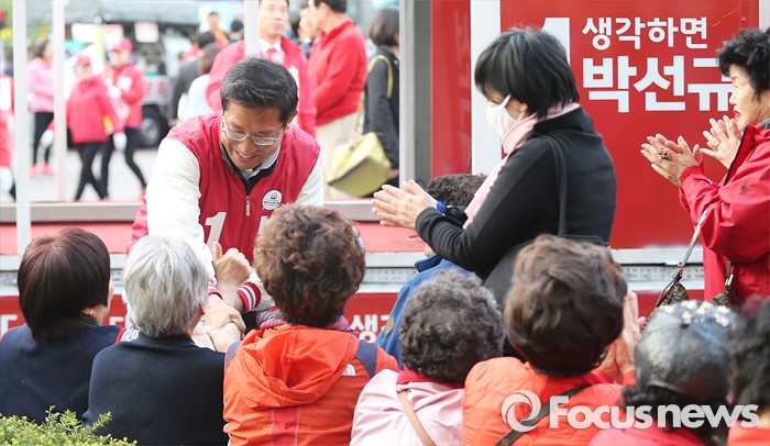 (서울=포커스뉴스) 4.13총선을 하루 앞둔 12일 오후 서울 영등포구 당산역 인근에서 박선규 새누리당 영등포갑 후보가 시민들과 악수하고 있다.