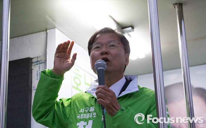 (광주=포커스뉴스) 4.13총선을 하루 앞둔 12일 오후 광주 서구 화정동 염주사거리에서 천정배 국민의당 광주 서구을 후보가 선거유세를 하고 있다.
