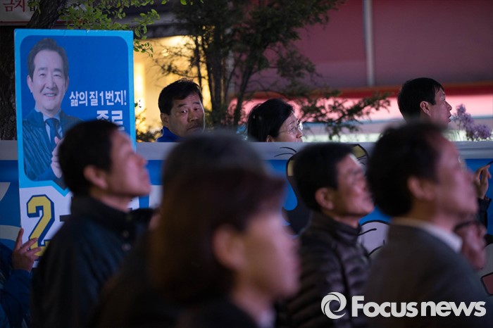 (서울=포커스뉴스) 20대 총선을 하루 앞둔 12일 오후 서울 종로구의 한 아파트 일대에서 유권자들이 정세균 더불어민주당 종로구 후보가 막바지 선거유세를 지켜보고 있다.