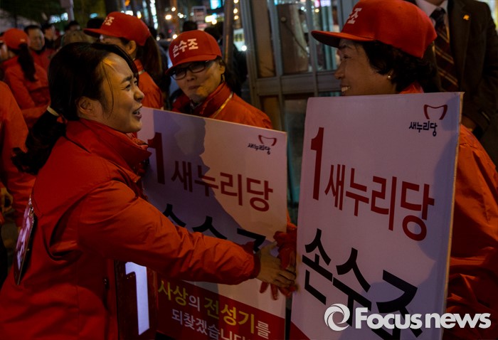 (부산=포커스뉴스) 4.13총선 선거운동 마지막날인 12일 오후 부산 사상구 엄궁초등학교 인근에서 손수조 새누리당 부산 사상구 후보가 지지자들과 악수하고 있다.