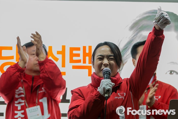 (부산=포커스뉴스) 4.13총선 선거운동 마지막날인 12일 오후 부산 사상구 엄궁초등학교 인근에서 손수조 새누리당 부산 사상구 후보가 유권자들의 지지를 호소하고 있다.