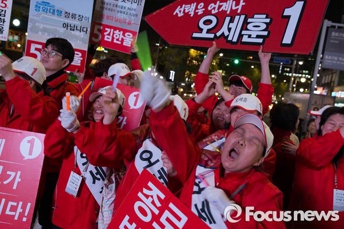 (서울=포커스뉴스) 20대 총선을 하루 앞둔 12일 오후 서울 종로구 경복궁역 일대에서 오세훈 새누리당 종로구 후보측이 막바지 선거유세를 하고 있다.