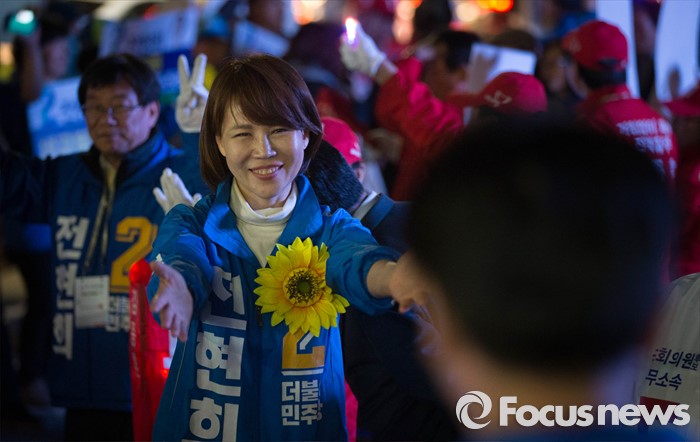 (서울=포커스뉴스) 공식 선거운동이 끝나는 12일 오후 서울 강남구 수서역 앞에서 전현희 더불어민주당 후보가 퇴근길 시민들을 향해 유세를 하고 있다.