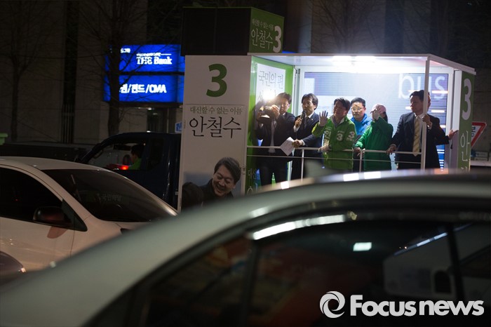 (서울=포커스뉴스) 4.13총선을 하루 앞둔 12일 오후 서울 노원구 롯데백화점 정문 앞에서 안철수 국민의당 상임공동대표가 막바지 선거 유세를 마친 뒤 유세차량을 타고 이동하고 있다.