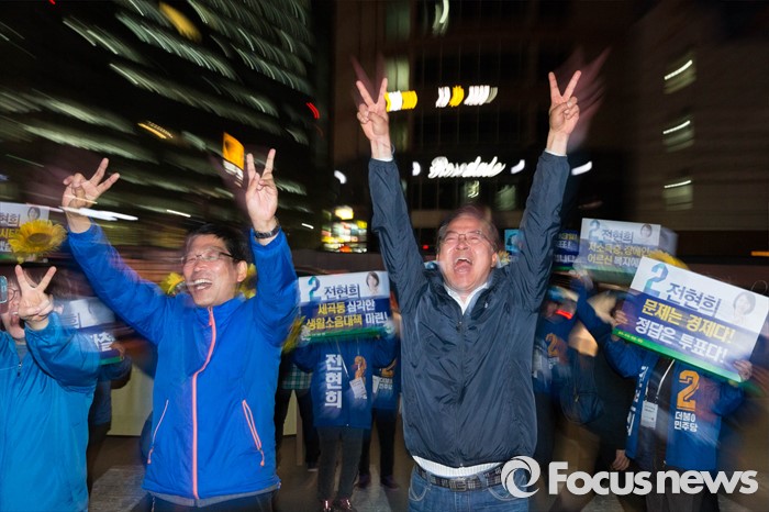 (서울=포커스뉴스) 공식 선거운동이 끝나는 12일 오후 서울 강남구 수서역 앞에서 전현희 더불어민주당 후보와 자원봉사자들이 퇴근길 시민들을 향해 유세를 하고 있다.