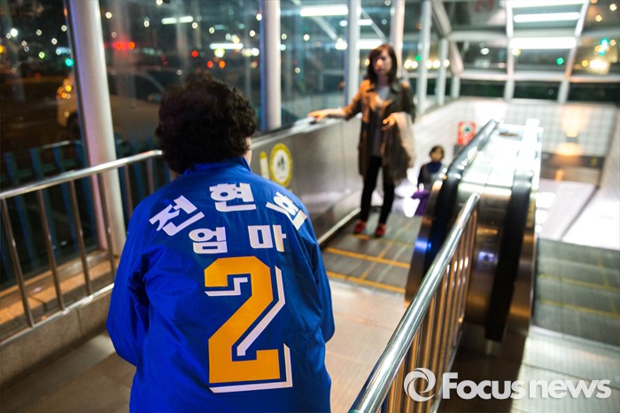 (서울=포커스뉴스) 공식 선거운동이 끝나는 12일 오후 서울 강남구 수서역 앞에서 전현희 더불어민주당 후보와 자원봉사자들이 퇴근길 시민들을 향해 유세를 하고 있다.