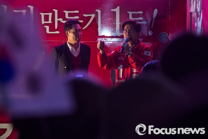 (대구=포커스뉴스) 김문수 새누리당 대구 수성구갑 후보가 12일 오후 대구광역시 수성구 신매광장에서 유세를하며 유권자들에게 한 표를 호소 하고 있다.