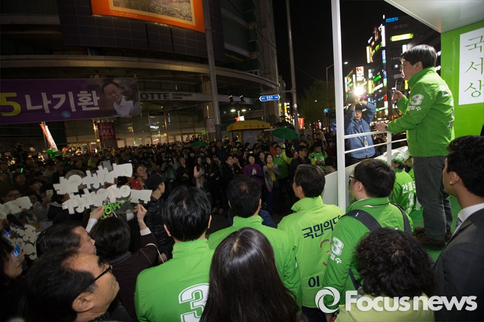 (서울=포커스뉴스) 4.13총선을 하루 앞둔 12일 오후 서울 노원구 롯데백화점 정문 앞에서 안철수 국민의당 상임공동대표가 막바지 선거 유세를 하고 있다.