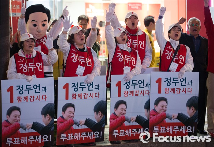 (서울=포커스뉴스) 제20대 국회의원 선거를 하루 앞둔 12일 오후 서울 은평구 증산역 앞에서 정두언 새누리당 서대문을 후보 선거운동원들이 구호를 외치고 있다.