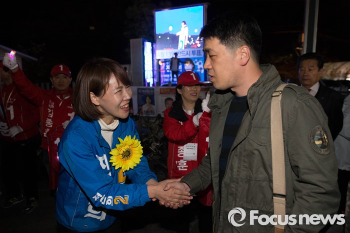 (서울=포커스뉴스) 공식 선거운동이 끝나는 12일 오후 서울 강남구 수서역 앞에서 전현희 더불어민주당 후보가 퇴근길 시민들을 향해 유세를 하고 있다.