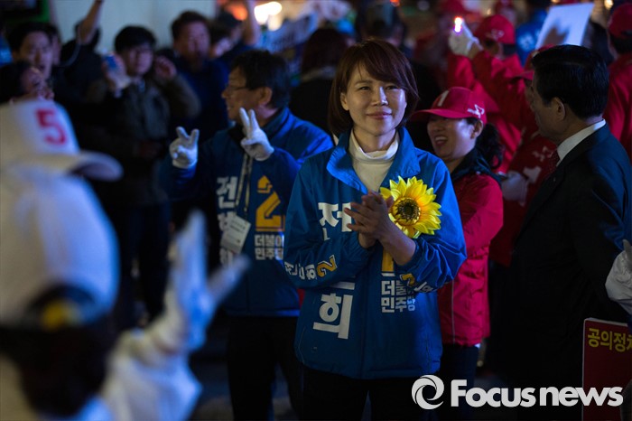 (서울=포커스뉴스) 공식 선거운동이 끝나는 12일 오후 서울 강남구 수서역 앞에서 전현희 더불어민주당 후보가 퇴근길 시민들을 향해 유세를 하고 있다.
