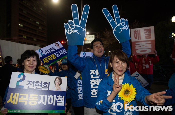 (서울=포커스뉴스) 공식 선거운동이 끝나는 12일 오후 서울 강남구 수서역 앞에서 전현희 더불어민주당 후보와 자원봉사자들이 퇴근길 시민들을 향해 유세를 하고 있다.