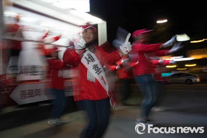 (서울=포커스뉴스) 20대 총선을 하루 앞둔 12일 오후 서울 종로구 경복궁역 일대에서 오세훈 새누리당 종로구 후보측이 막바지 선거유세를 하고 있다.
