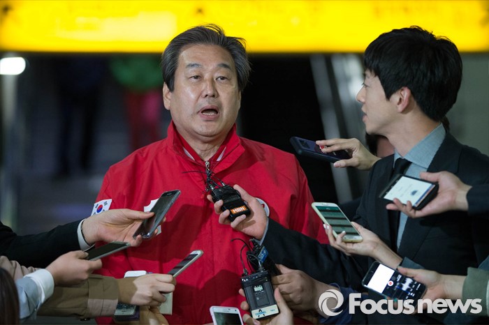 (서울=포커스뉴스) 20대 총선을 하루 앞둔 12일 오후 서울 용산구 서울역 KTX 플랫폼에서 김무성 새누리당 대표가 부산으로 가기 전 기자들의 질문을 받고 있다.