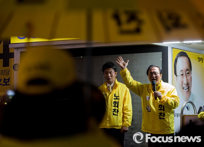 (창원=포커스뉴스) 4.13총선 선거운동 마지막날인 12일 오후 경남 창원시 상남분수광장에서 노회찬 정의당 창원 성산구 후보가 유권자들의 지지를 호소하고 있다.