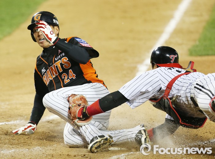 (서울=포커스뉴스) 12일 서울 잠실구장에서 열린 2016 프로야구 롯데-LG 경기 7회초 2사 2루에서 롯데 손아섭의 좌익수앞 안타때 2루주자 김문호가 홈인하고 있다.