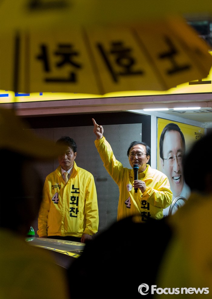 (창원=포커스뉴스) 4.13총선 선거운동 마지막날인 12일 오후 경남 창원시 상남분수광장에서 노회찬 정의당 창원 성산구 후보가 유권자들의 지지를 호소하고 있다.