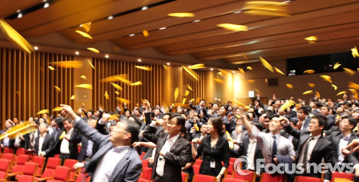 송 대표는 “회사 생활이 행복하고 즐거워야 업무에 몰입하고 창의적인 아이디어도 나올 수 있다”며 “임직원 상호간 소통을 더욱 활성화하여 강하고 끈끈한 저력으로 스마트하게 일하는 LG상사 고유의 모습을 만들어 가겠다”고 말했다.LG상사 임직원들이 12일 여의도 LG트윈타워 대강당에 모여 회사와 동료에게 바라는 각자의 소망을 적은 종이 비행기를 접어 날리고 있다. <사진제공=LG상사>