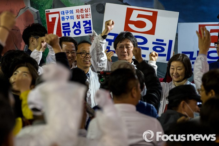 (대구=포커스뉴스) 권은희(오른쪽부터) 무소속 대구 북구갑 후보, 유승민 무소속 대구 동구을 후보, 류성걸 대구 동구갑 후보가 12일 오후 대구광역시 동구 평화시장 닭똥집골목에서 마무리 합동유세를 펼치고 있다.