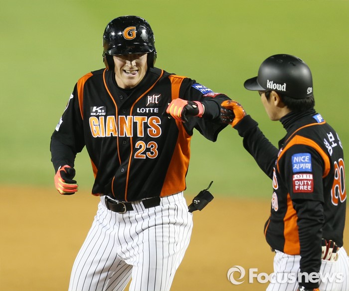 (서울=포커스뉴스) 12일 서울 잠실구장에서 열린 2016 프로야구 롯데-LG 경기 9회초 2사 1,2루에서 롯데 대타 아두치가 좌전 안타로 동점을 만들고 1루에서 정보명 코치와 주먹을 마주치고 있다.