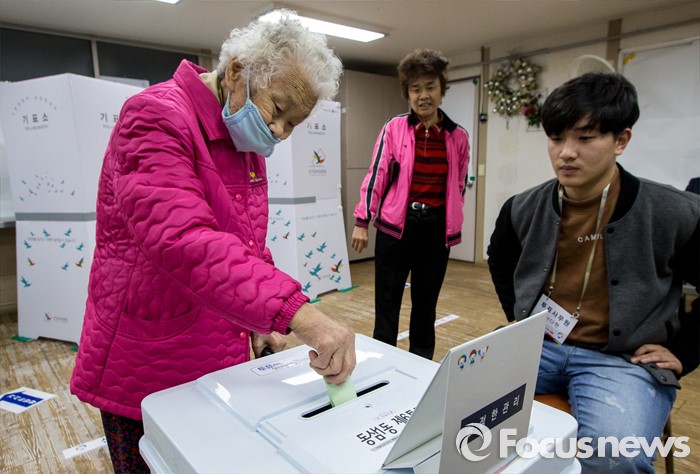 (부산=포커스뉴스) 제20대 국회의원선거일인 13일 오전 부산 영도구 동삼1동 제6투표소에서한 노인이 투표하고 있다.