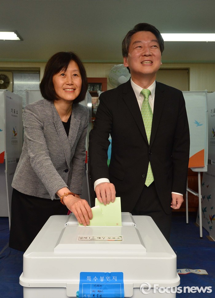 (서울=포커스뉴스) 안철수 국민의당 상임공동대표가 제20대 국회의원선거날인 13일 서울 노원구 상계1동 제7투표소에서 부인 김미경 씨와 투표를 하고 있다.