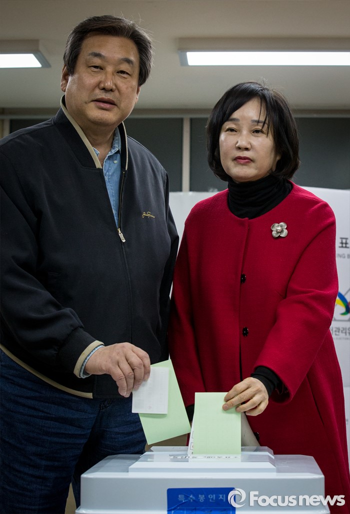 (부산=포커스뉴스) 제20대 국회의원선거일인 13일 오전 부산 영도구 동삼1동 제6투표소에서 김무성 새누리당 대표와 아내 최양옥 씨가 투표하고 있다.