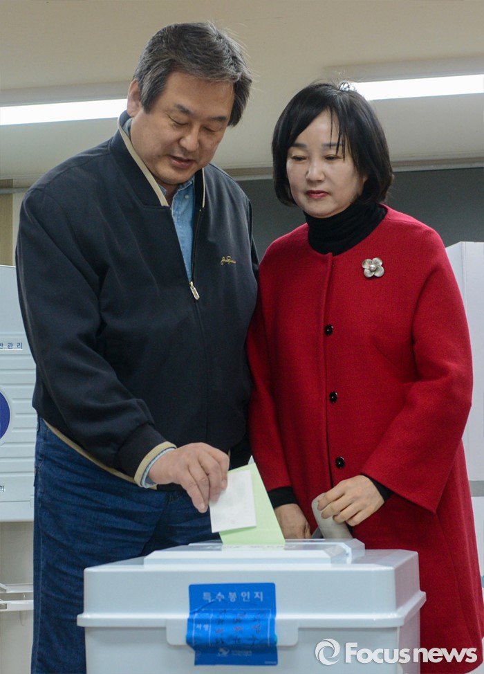 (부산=포커스뉴스) 제20대 국회의원선거일인 13일 오전 부산 영도구 동삼1동 제6투표소에서 김무성 새누리당 대표와 아내 최양옥 씨가 투표하고 있다.